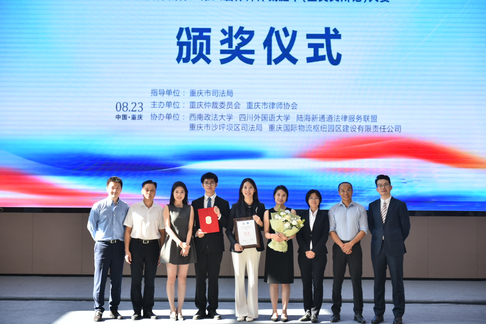 8月23日下午,由重庆市司法局指导,重庆仲裁委员会、重庆市律师协会主办的“重庆仲裁杯”第六届律师仲裁庭审(全英文辩论)大赛决赛在西部陆海新通道国际法务区盛大举行。本次大赛首次采用全英文庭审形式,从庭审书状材料准备到庭审现场,仲裁员、参赛选手、仲裁秘书均使用英文进行交流。